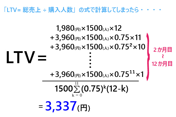 2~12か月目に獲得した新規顧客の分も含めてしまうので、LTVがかなり低い値になってしまう。